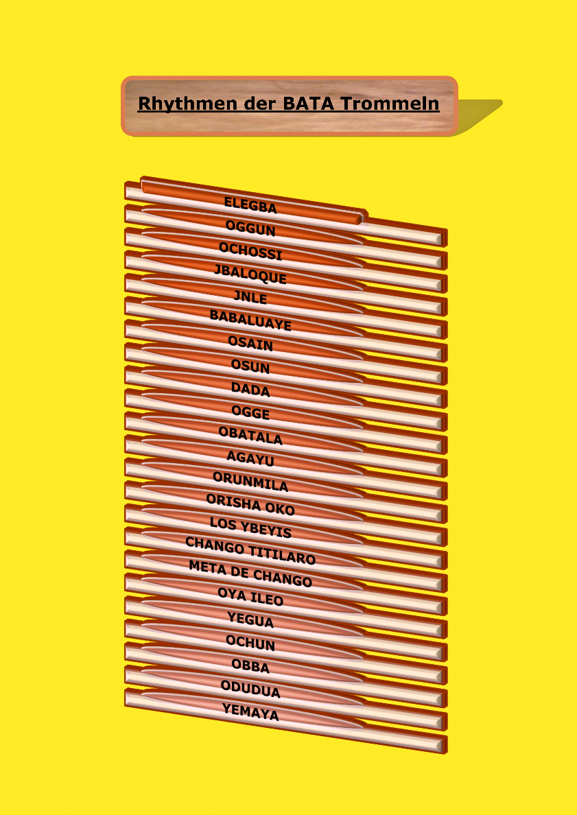 Diese Rhythmen werden in Cuba trocken durch gespielt. Das heisst ohne Gesang und Tanz. Jeder dieser Rhythmen beinhalten noch weitere abfolgende Rhythmen die durch den Trommler mit der tiefsten Stimme, also der Yia, der Muttertrommel die im Spiel durch einen rhythmischen Ruf den Wechsel kunt tut und somit die 2.Trommel der Okonkolo, also der nächsten höheren Stimme der Trommel, eine rhythmische Antwort spielt.